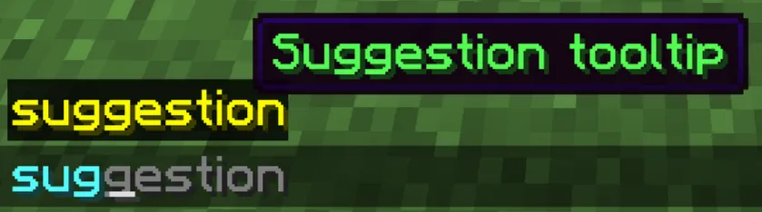 Section titled “Suggestions”The following overloads of the SuggestionsBuilder#suggest method add values that will be send to the client as argument suggestions: